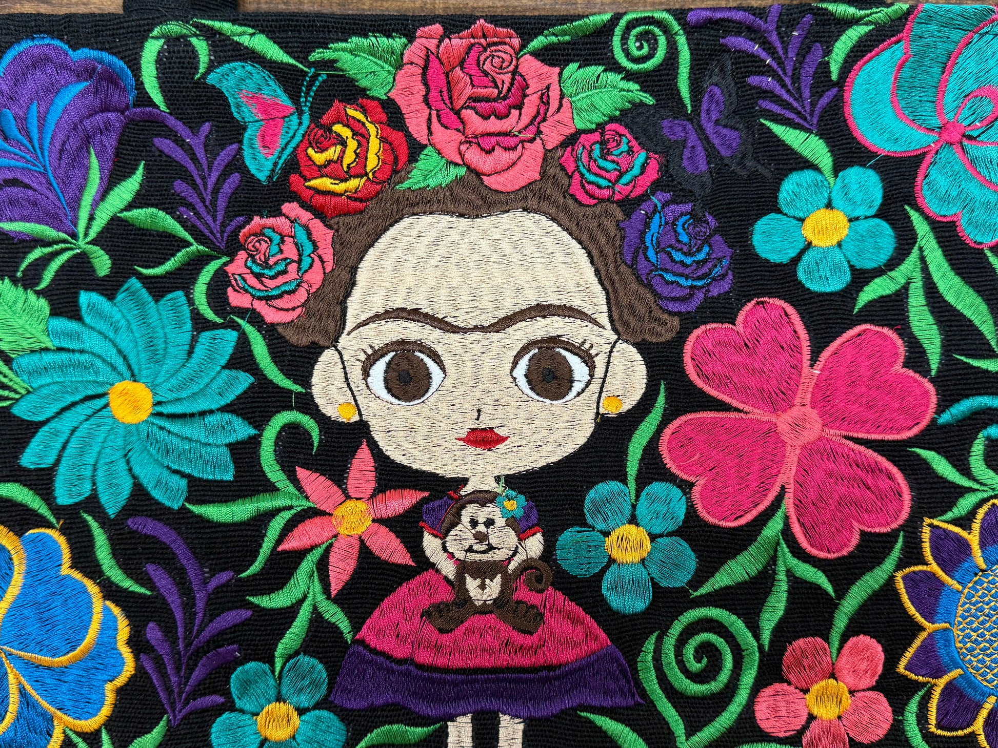 This Frida purse is beautifully embroidered with bright colors and flowers. It is the perfect accessory to compliment your outfit for the celebration of the Day of the Death or 5 de Mayo festivities. The bag has two additional zippers on the back for extra storage.