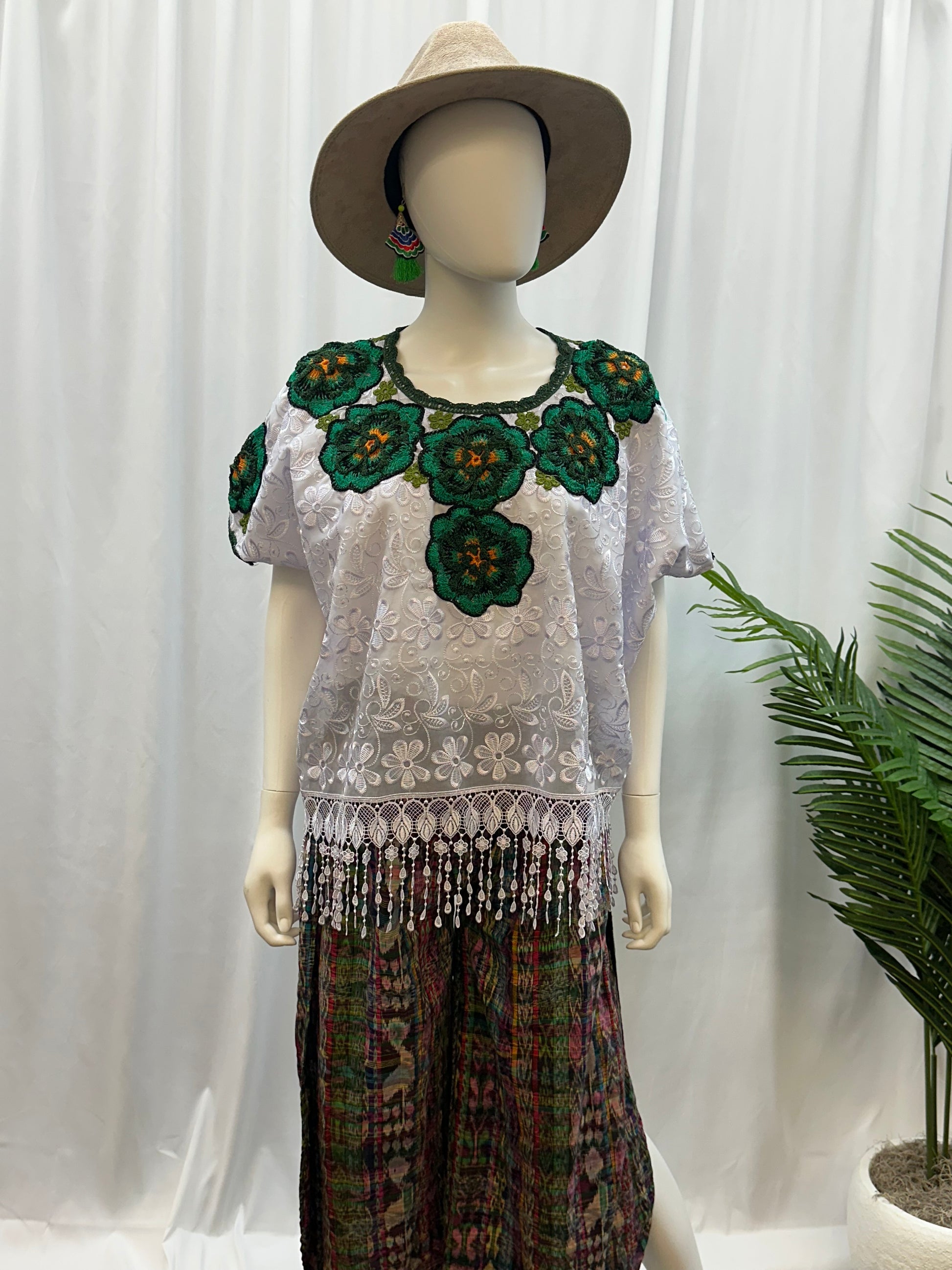 This beautiful and unique huipil has delicate crochet roses front, back and on sleeves. The rest of the huipil is made out of silk with fringe at the bottom, giving it a flirty look.  Made in Aguacatan, Huehuetenango