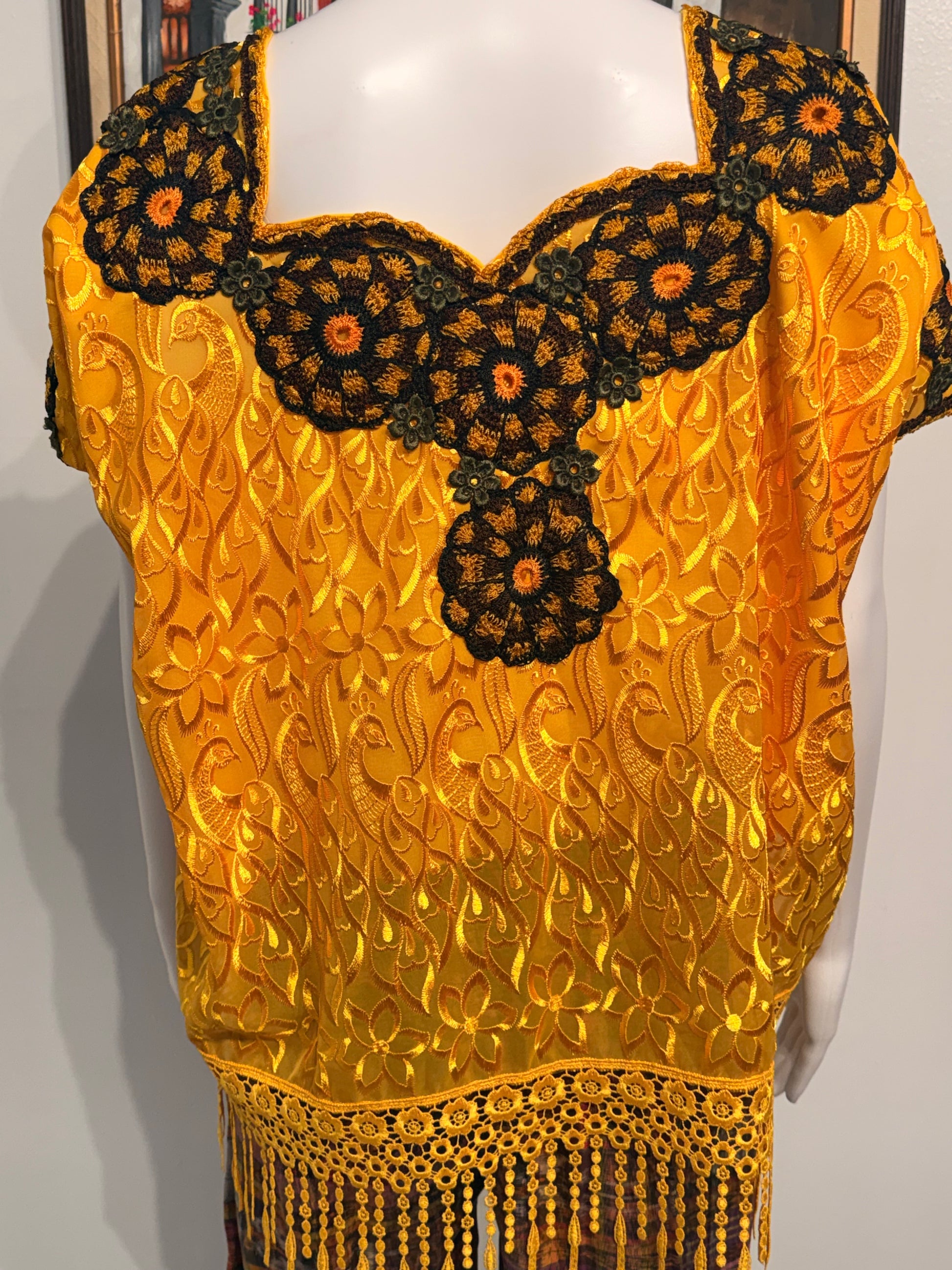 This beautiful and unique huipil has delicate crochet roses front, back and on sleeves. The rest of the huipil is made out of silk with fringe at the bottom, giving it a flirty look. Made in Patzu, Chimaltenango Guatemala