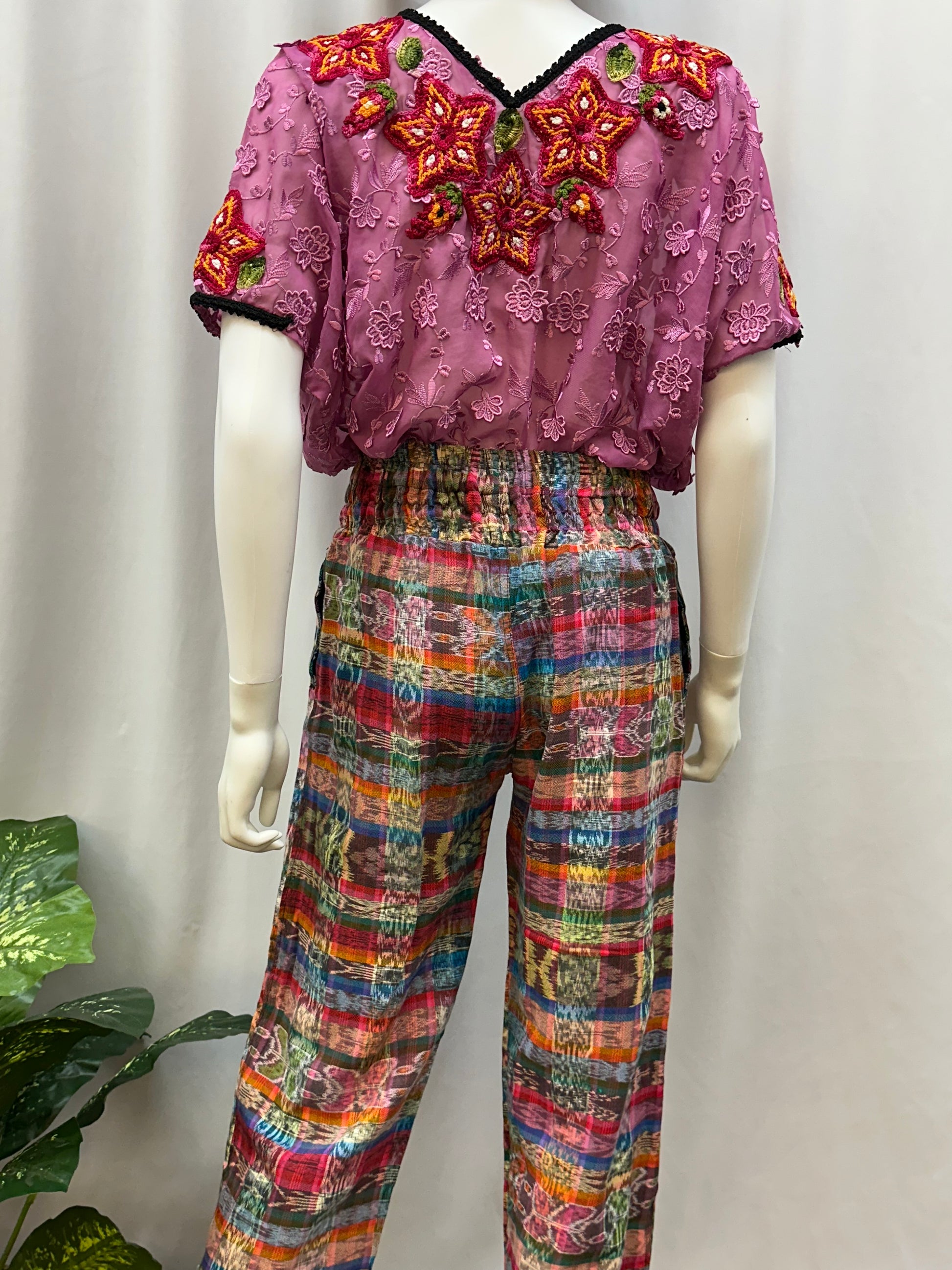One of a kind handwoven pants with elastic waist for adjustable fit. Each pattern and color represents a Mayan city in Guatemala. The patterns and colors make this piece a must have in your wardrobe. Locals artisan use natural dyes from plants for color. This beautiful pants was handwoven in San Lucas Sacatepequez, Guatemala.