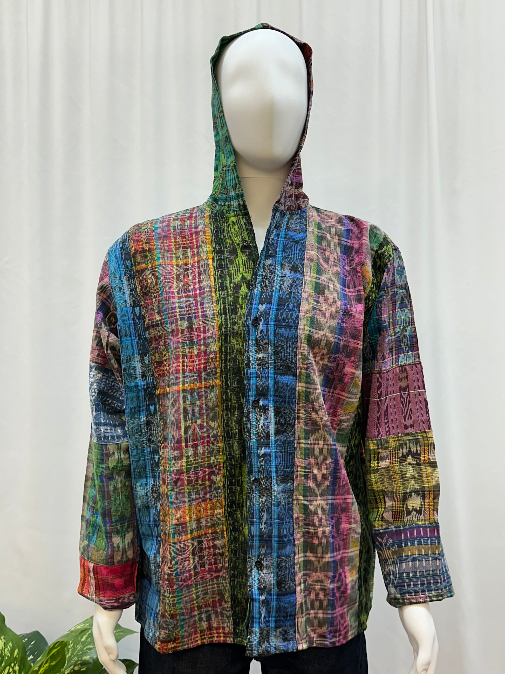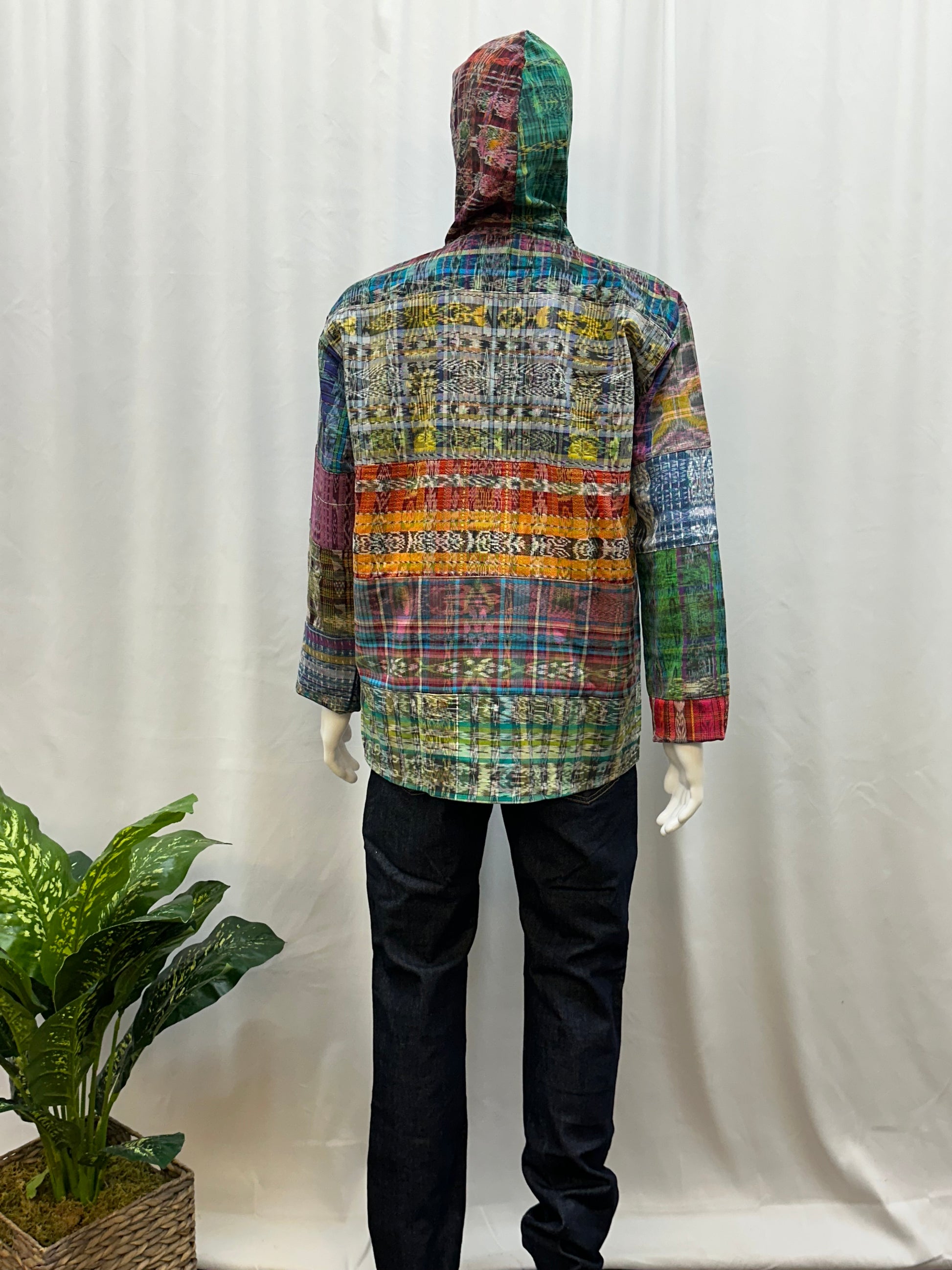 One of a kind handwoven patchwork long sleeve button up shirt with hoddie. Each patchwork represents a Mayan city in Guatemala. The patterns and colors make this piece a must have in your wardrobe. Locals artisan use natural dyes from plants to each pattern.