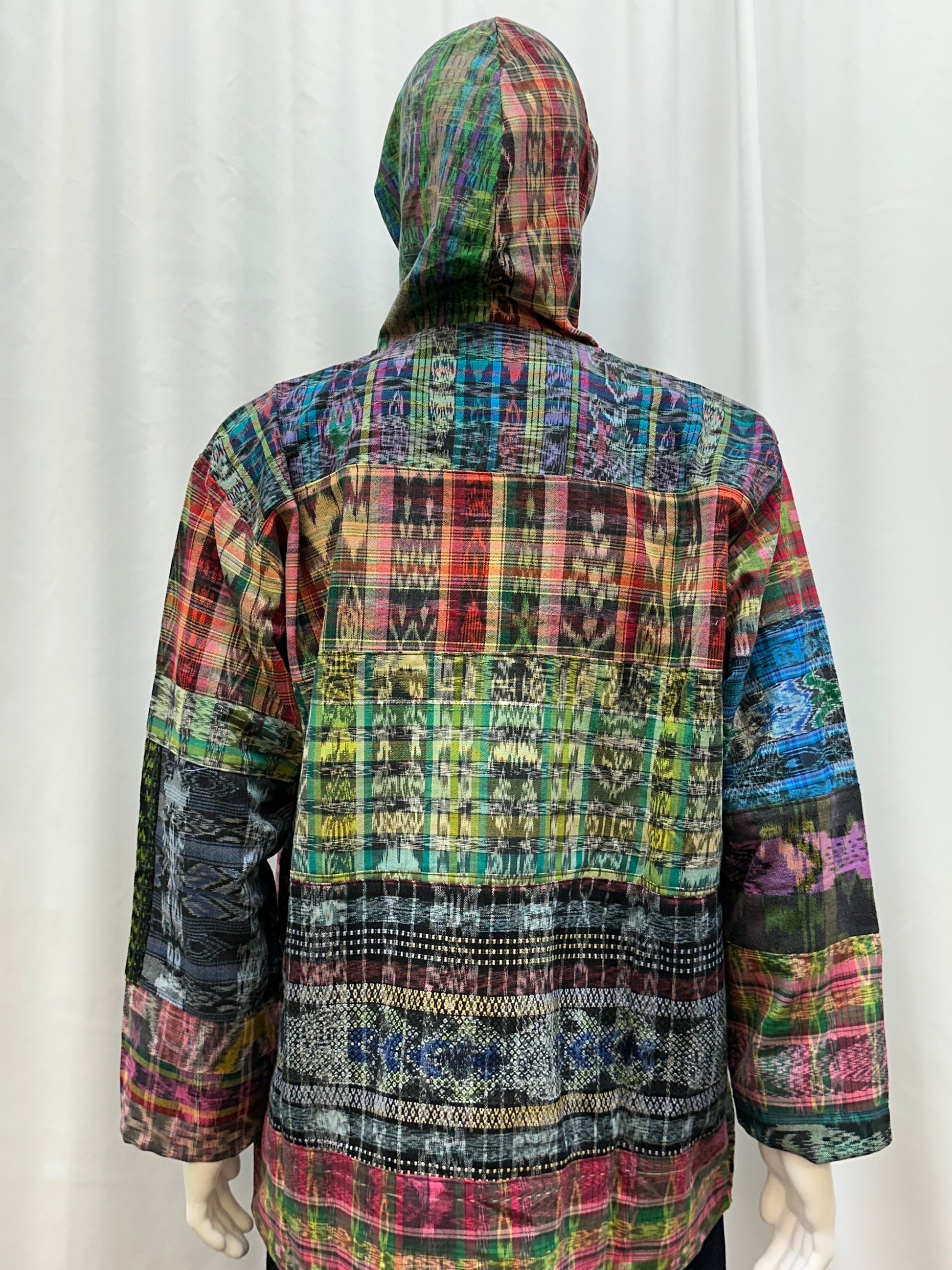 One of a kind handwoven patchwork long sleeve button up shirt with hoddie. Each patchwork represents a Mayan city in Guatemala. The patterns and colors make this piece a must have in your wardrobe. Locals artisan use natural dyes from plants to each pattern.