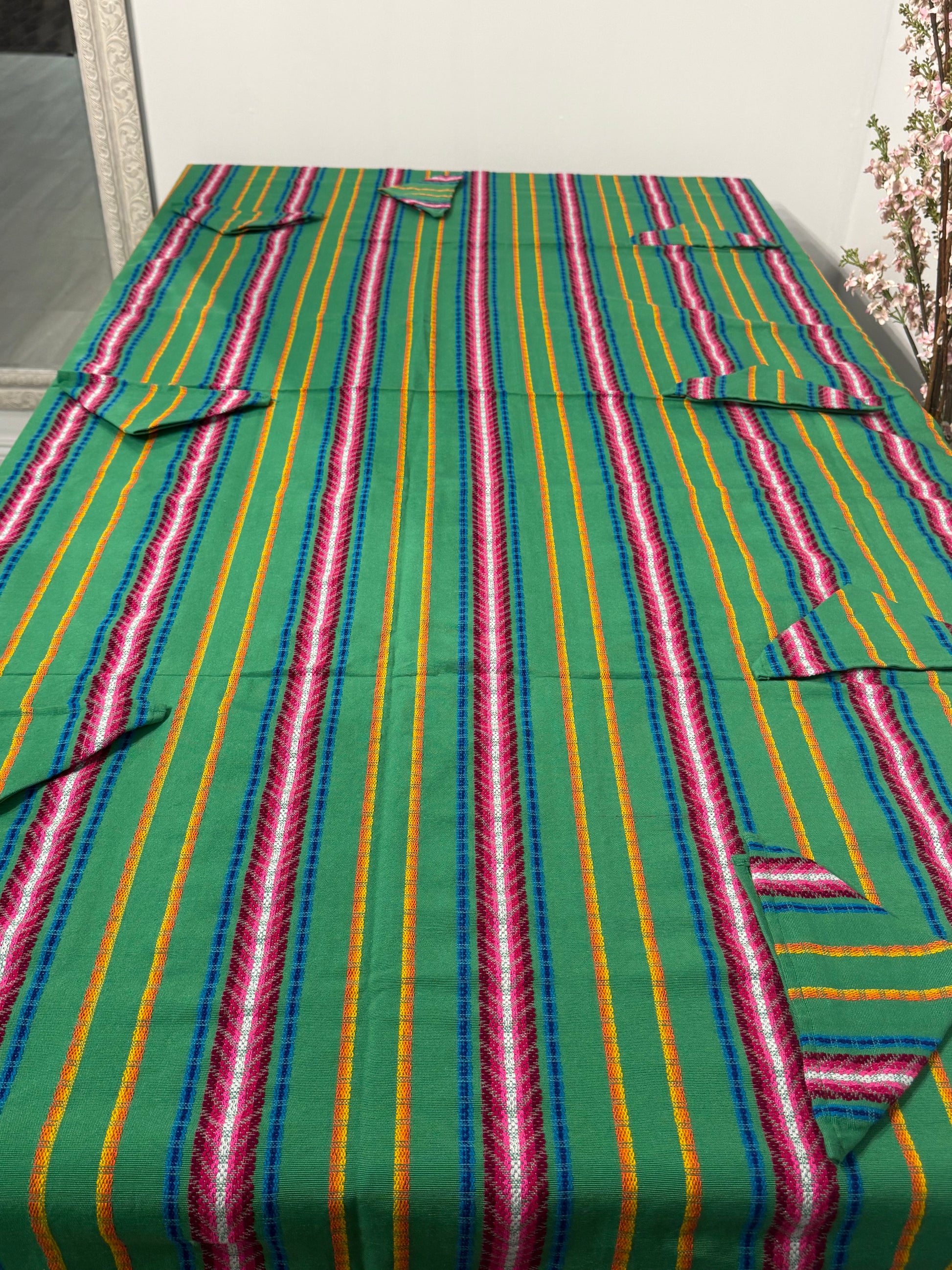 Beautiful traditional handwoven Guatemalan table cover. It's vibrant colors and patterns make this piece exceptional. The table cover comes with 8 napkins. I would suggest washing table cover separate with cold water only and air dry. Made in Coban, Guatemala.