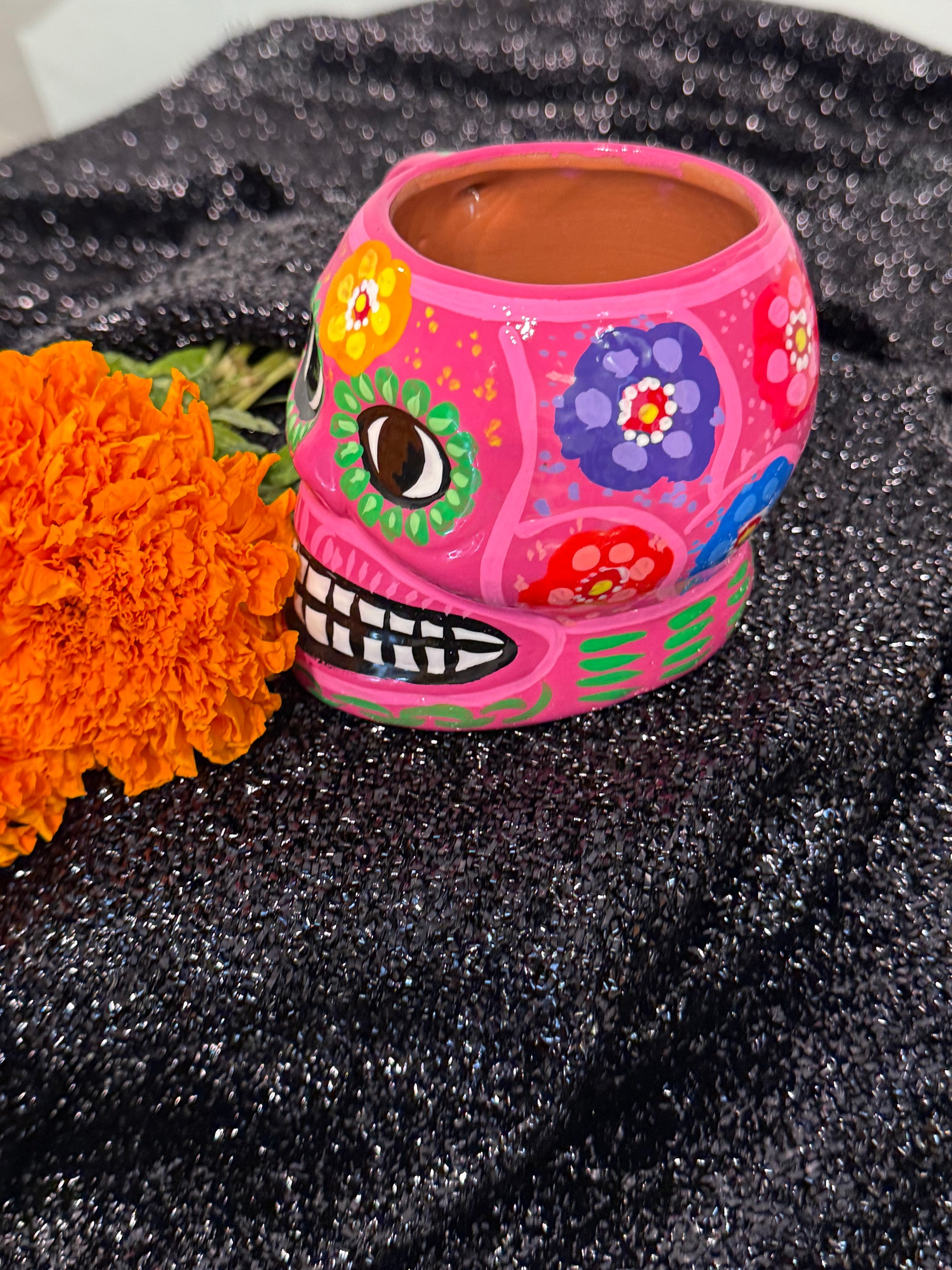 Hand painted Dia de los Muertos skull mug for home decor. Each mug measures 5" tall by 4" wide. This cute mug is well painted and has beautiful bright colors, it is perfect for Halloween decor.
