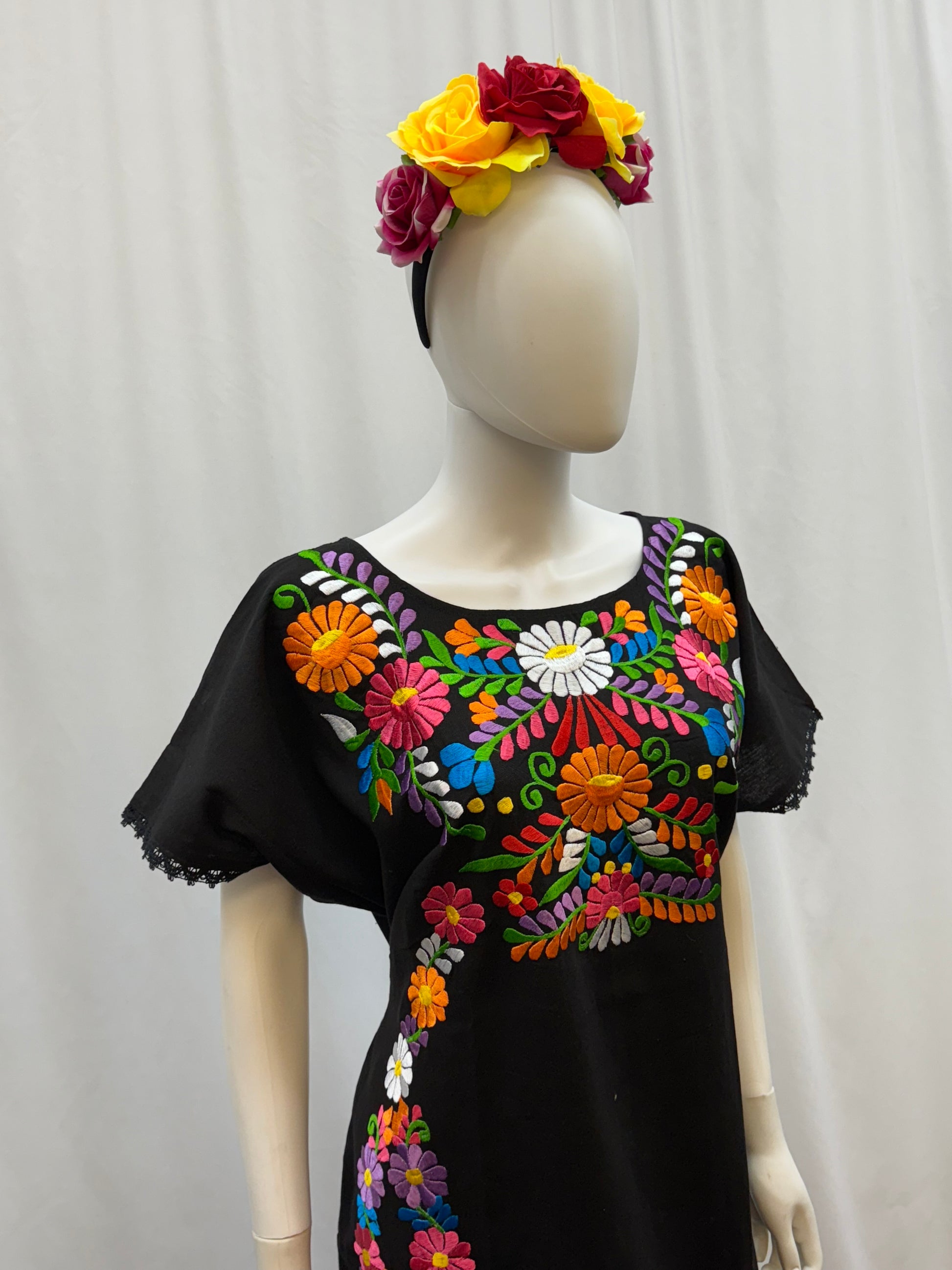 This dress is exceptionally beautiful and comfortable. The embroidery has stunning bright flowers which make it stylish and elegant. It has straps on the back for adjustable fit and a slit on the right leg. This Catrina dress is perfect for the Day of the Death tradition, 5 de Mayo festivities or a special occasion.