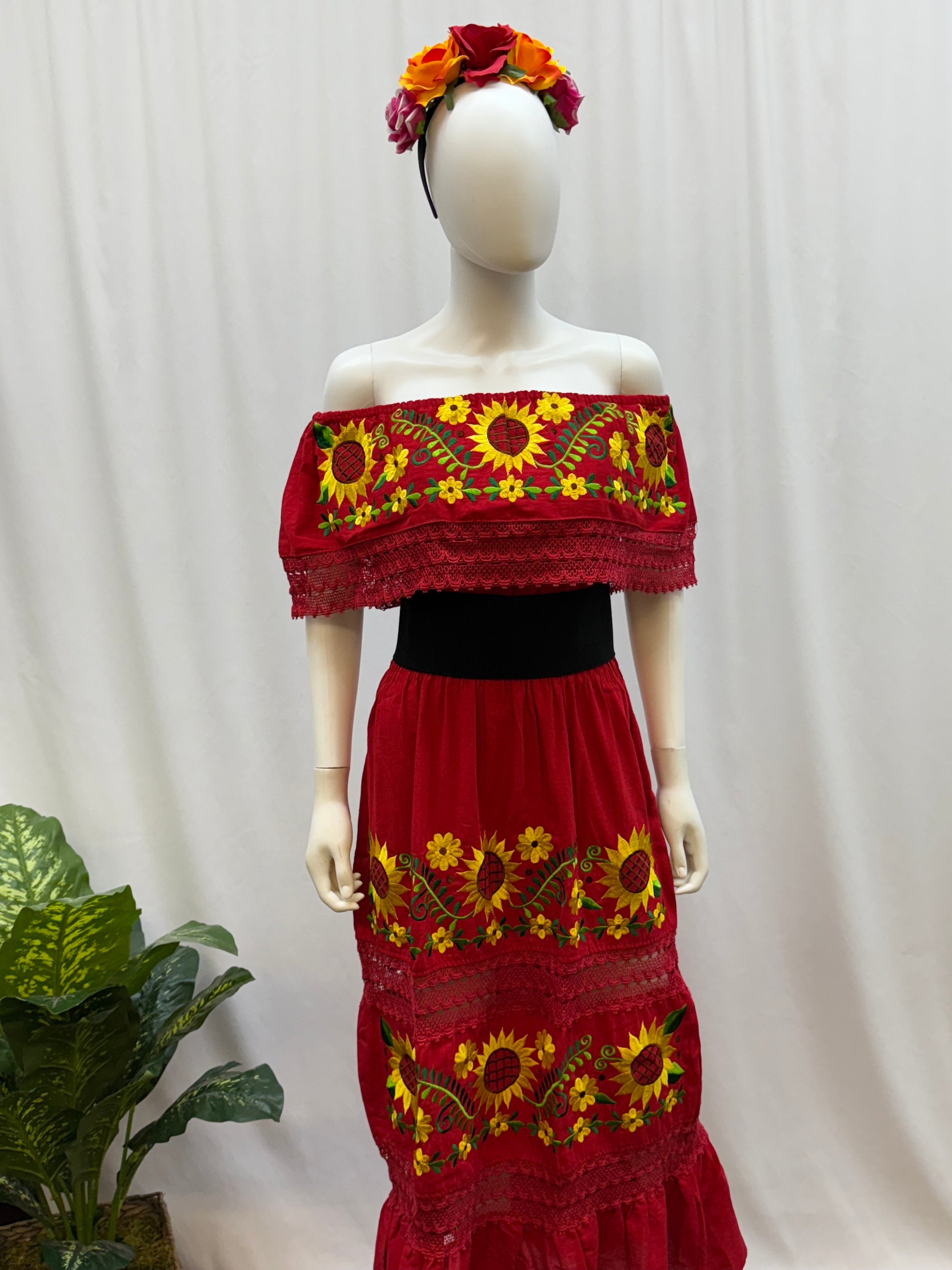 This dress is exceptionally beautiful and comfortable. The embroidery has stunning bright flowers which make it stylish and elegant. It has straps on the back for adjustable fit and elastic on the waist and shoulders. This Catrina dress is perfect for the Day of the Death tradition, 5 de Mayo festivities or a special occasion.