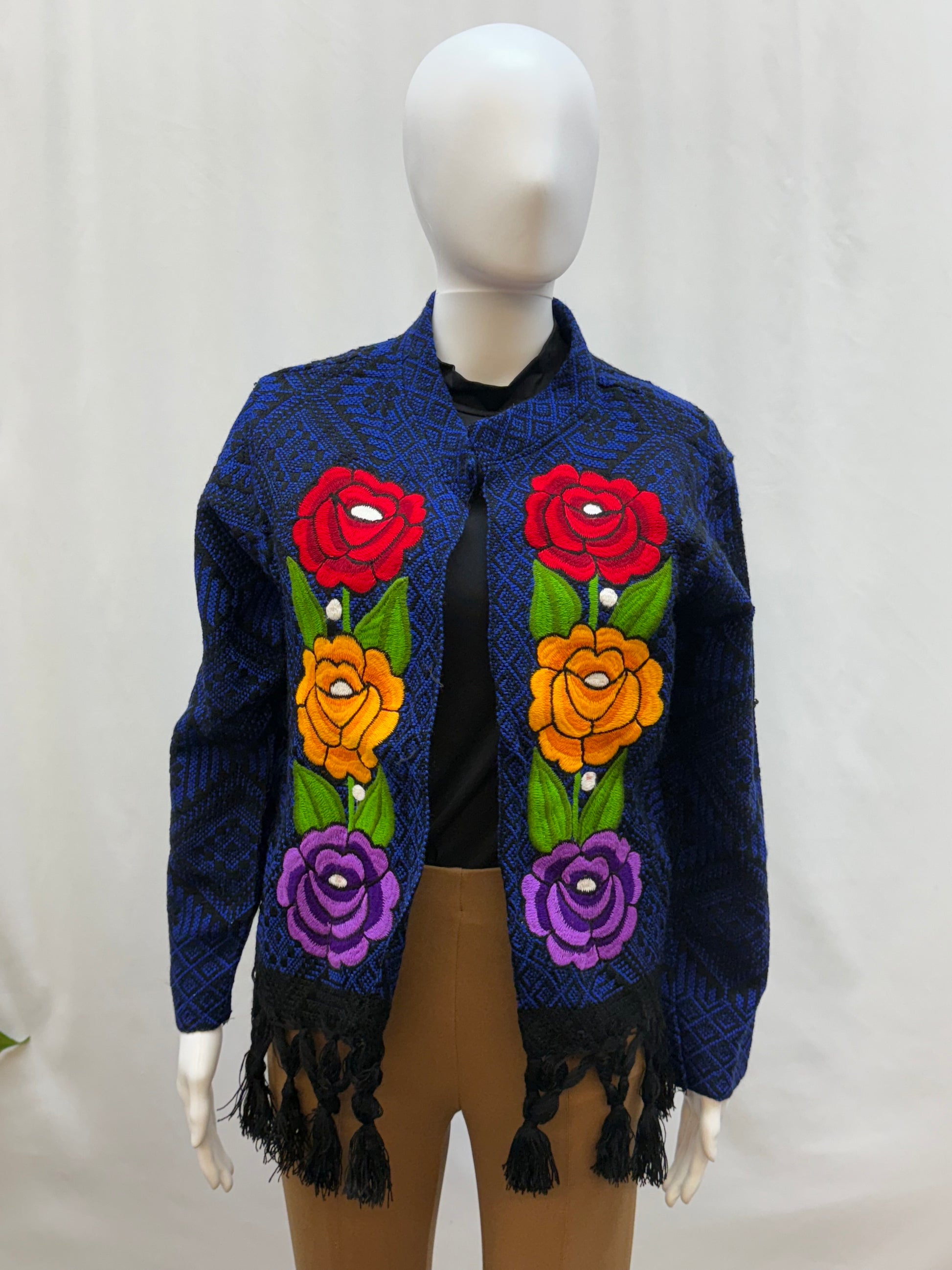 Stay stylish with this beautiful fringe jacket with embroidered roses. The fringe gives a modern touch to the embroidery.