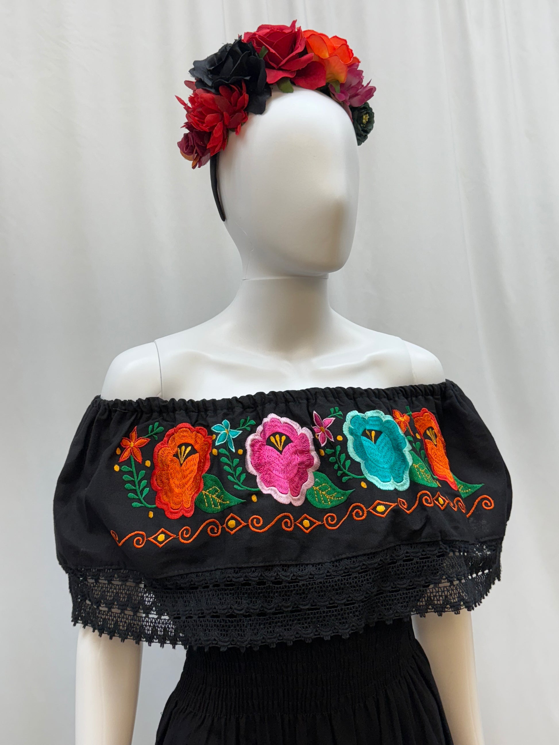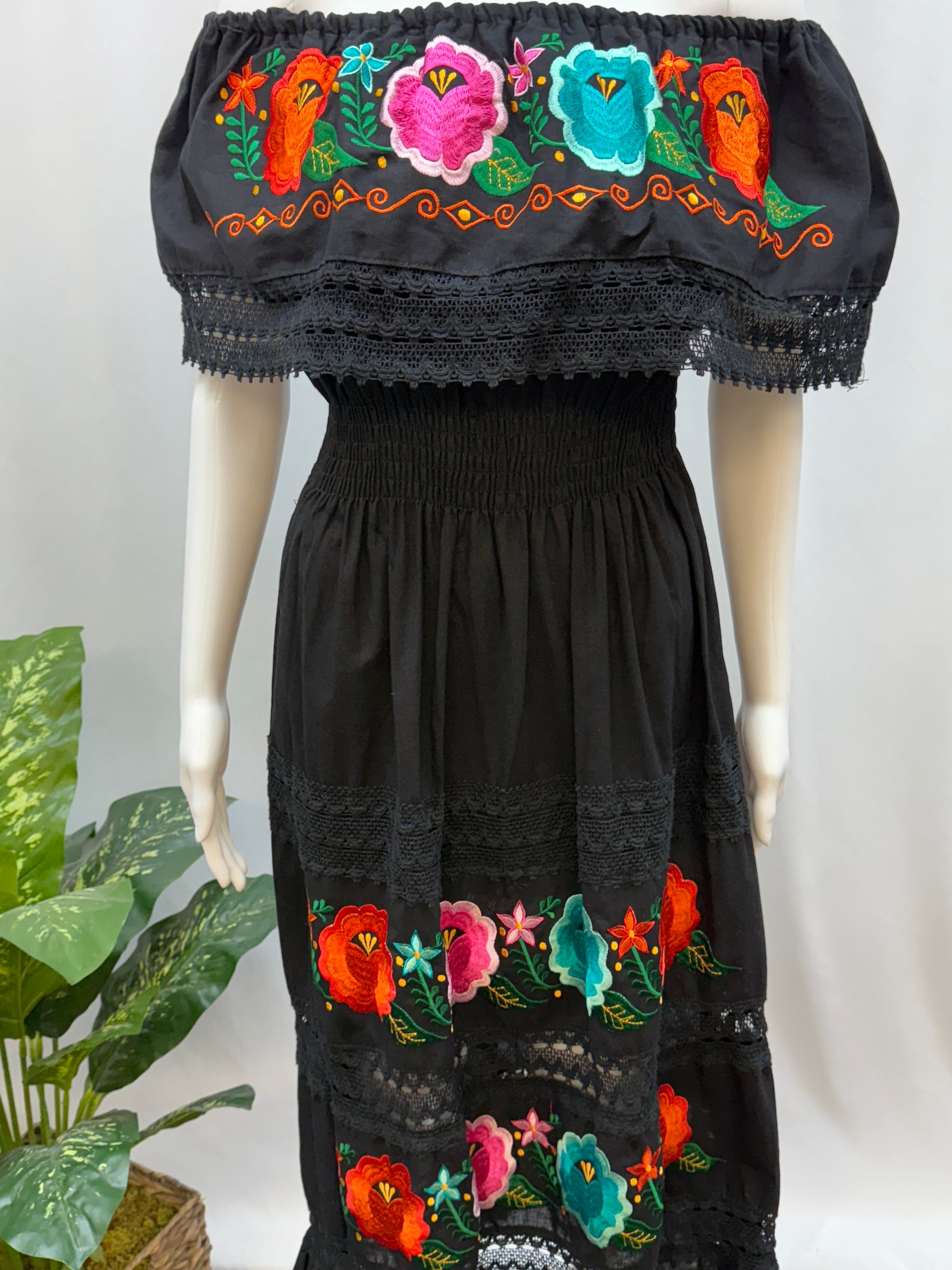This dress is exceptionally beautiful and comfortable. The embroidery has stunning bright flowers which make it stylish and elegant. It has straps on the back for adjustable fit and elastic on the waist and shoulders. This Catrina dress is perfect for the Day of the Death tradition, 5 de Mayo festivities or a special occasion.
